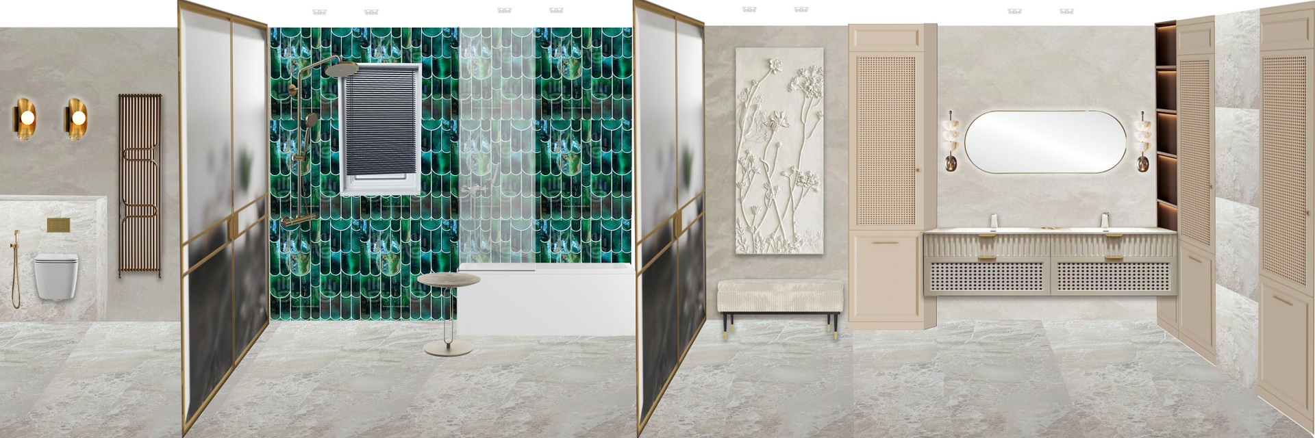 - Бескомпромиссные материалы: Полы — штучный паркет из ценных пород дерева (дуб, орех) сложной укладки. Стены — декоративная штукатурка, натуральный камень (травертин, мрамор). В ванных — крупноформатная керамика или мрамор. Всё подчинено тактильному и визуальному совершенству.