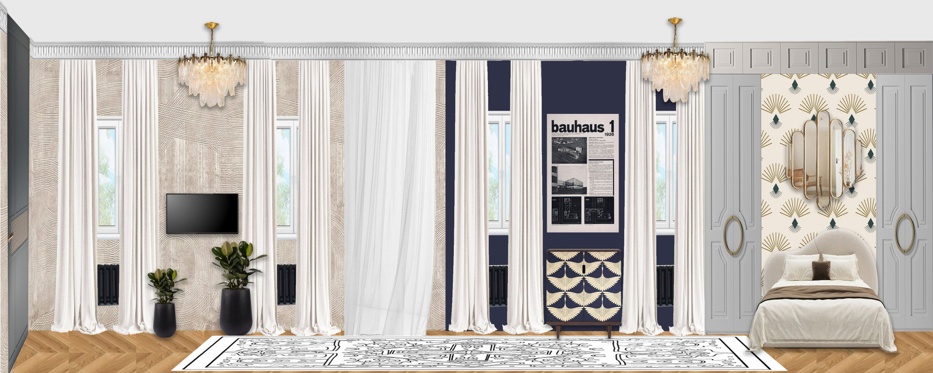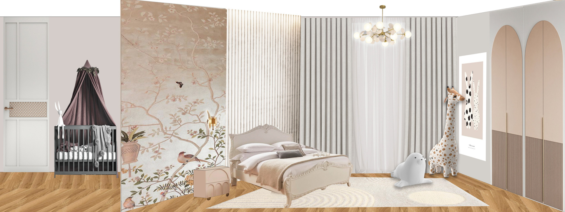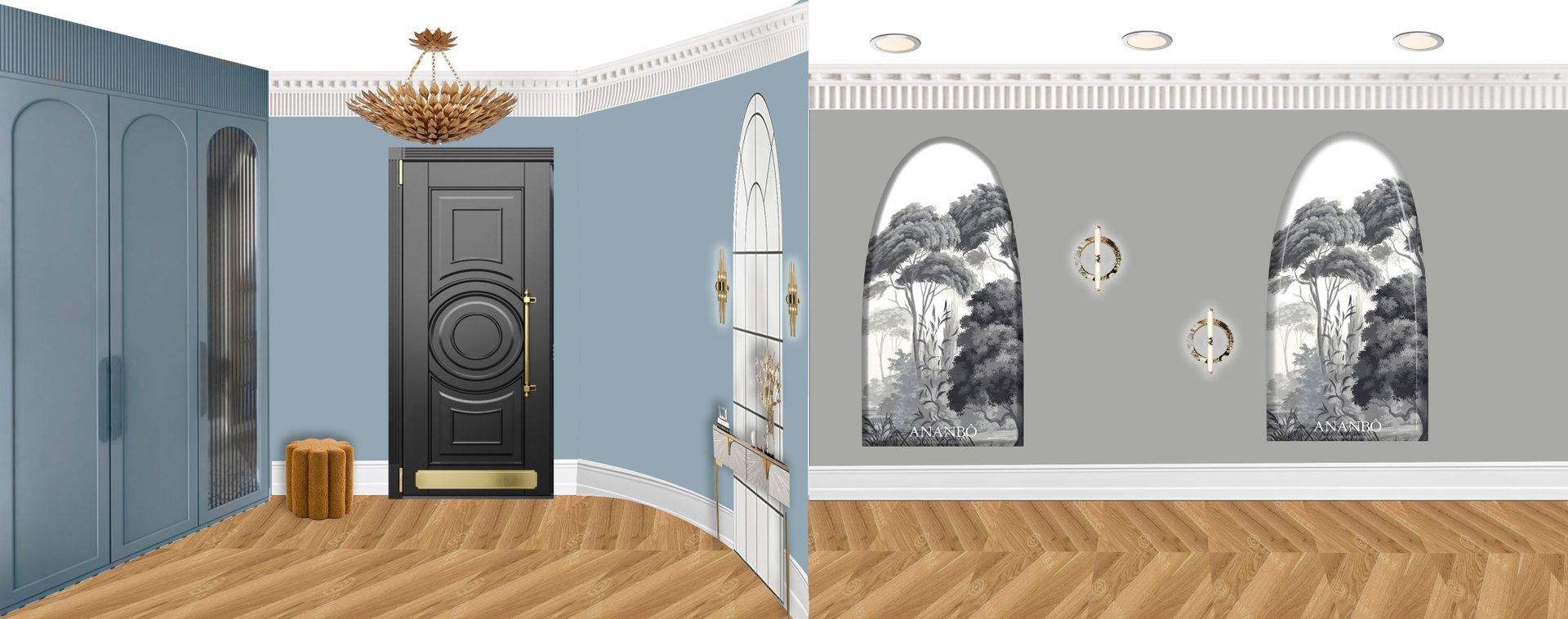 - Люстры как ювелирные украшения: Каждая люстра — центральный арт-объект и источник атмосферного света. Подобраны авторские модели от ведущих брендов или дизайнеров, где сочетаются хрусталь, бронза, позолота, муранское стекло. Они задают тон всему интерьеру, создавая эффектные акценты в гостиной, столовой и даже в детских зонах (в адаптированном, более игривом дизайне).