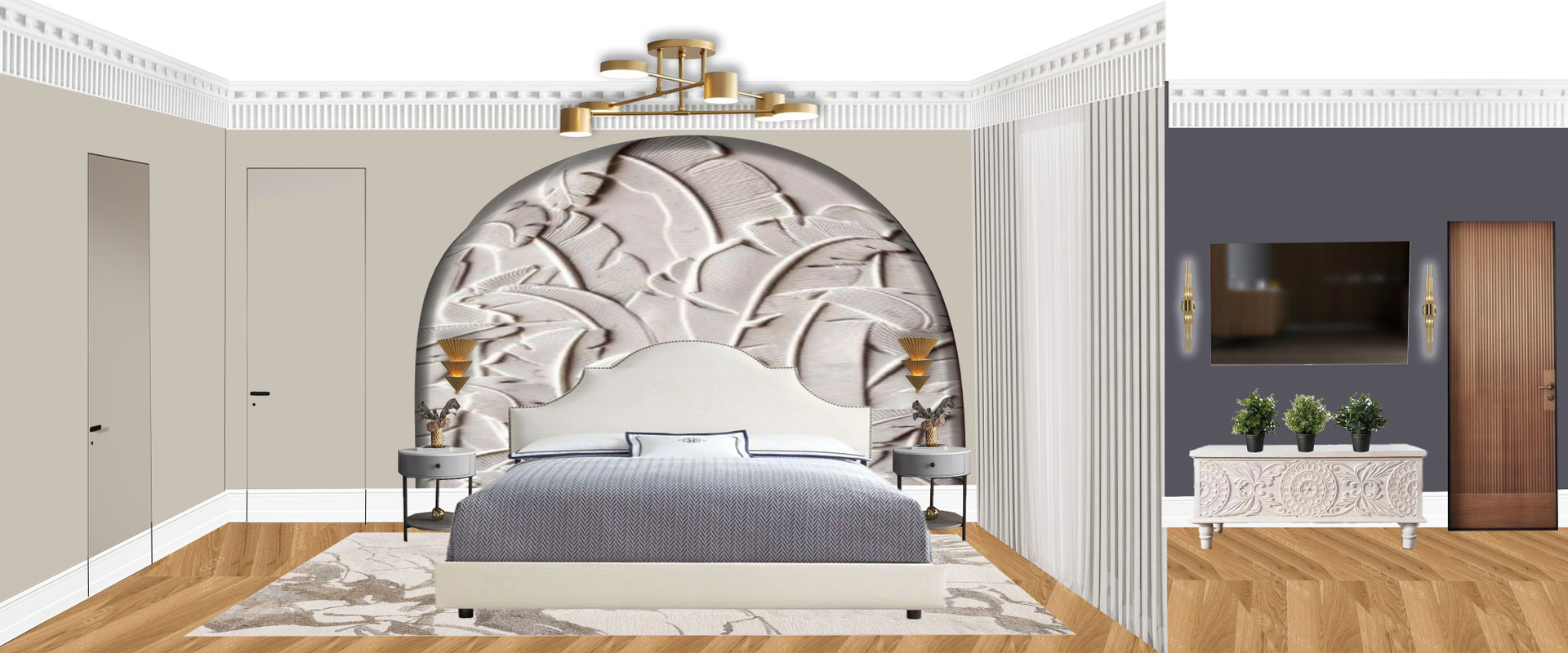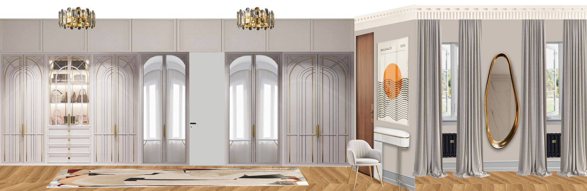 - Идеальный баланс гламура и уюта: Основой служит сдержанная классика с современными пропорциями. Стены и потолки, украшенные лепниной и молдингами, создают респектабельный фон. Палитра строится на благородных нейтральных тонах — глубоких серых, карамельных, бежевых, что обеспечивает спокойствие и служит идеальным холстом для предметов искусства.